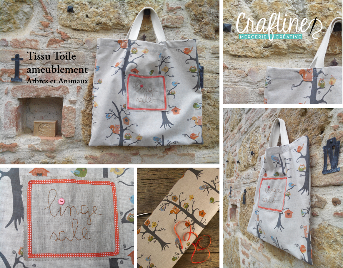 Nous avons choisi cet adorable tissu inspiré de la forêt avec pleins d’animaux et d’oiseaux perchés sur des arbres pour réaliser un sac de linge sale. Nous avons ajouter un coupon de lin où est brodé à la machine « linge sale » avec une couture simple.