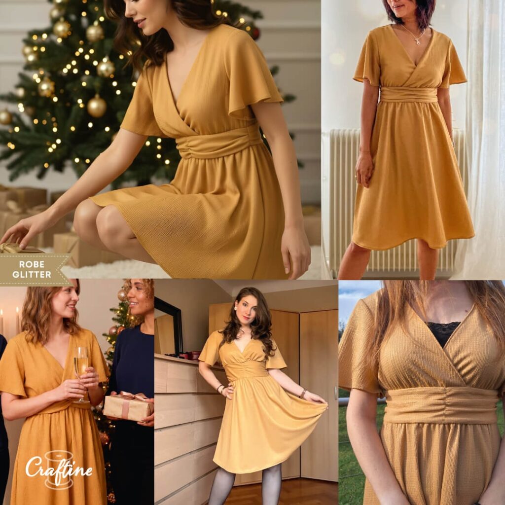 ✨Pour les fêtes, une soirée ou toute occasion spéciale, cette robe apportera une touche d’éclat à votre look avec son tissu crêpe miel pailleté. Sa coupe courte évasée et ses manches papillon subliment la silhouette avec douceur et féminité. Son décolleté croisé met joliment la poitrine en valeur, tandis que la ceinture sous poitrine avec effet drapé apporte une note raffinée.